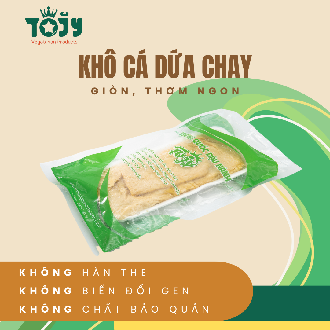 - Khô Cá Dứa Chay là món chay giả mặn được làm từ nguyên liệu chính là Đậu Hũ đáp ứng tiêu chí 3 KHÔNG:* KHÔNG BIẾN ĐỔI GEN - Non GMO